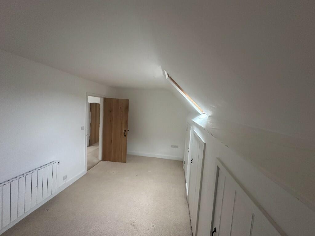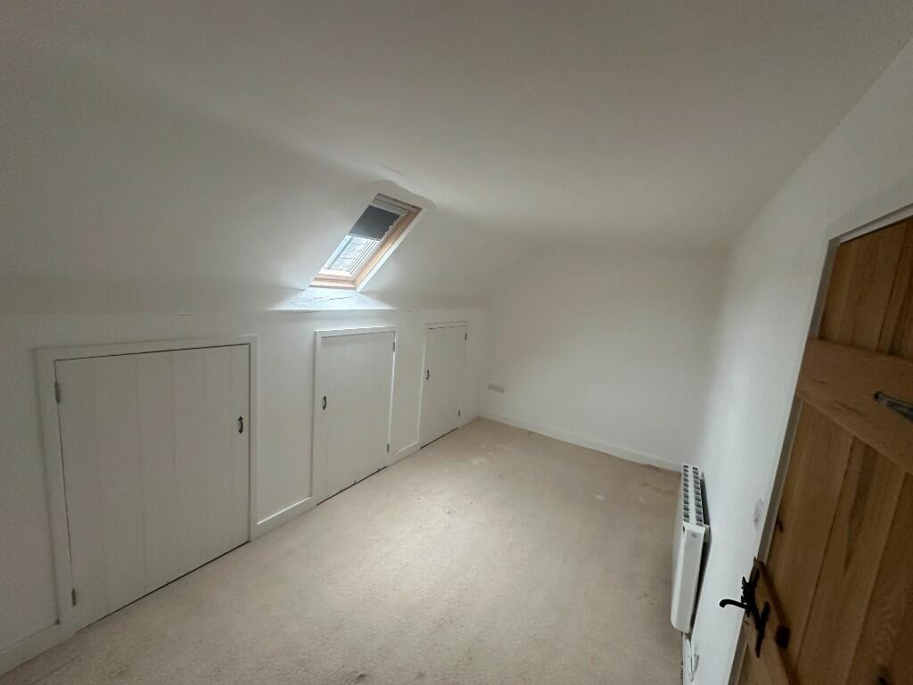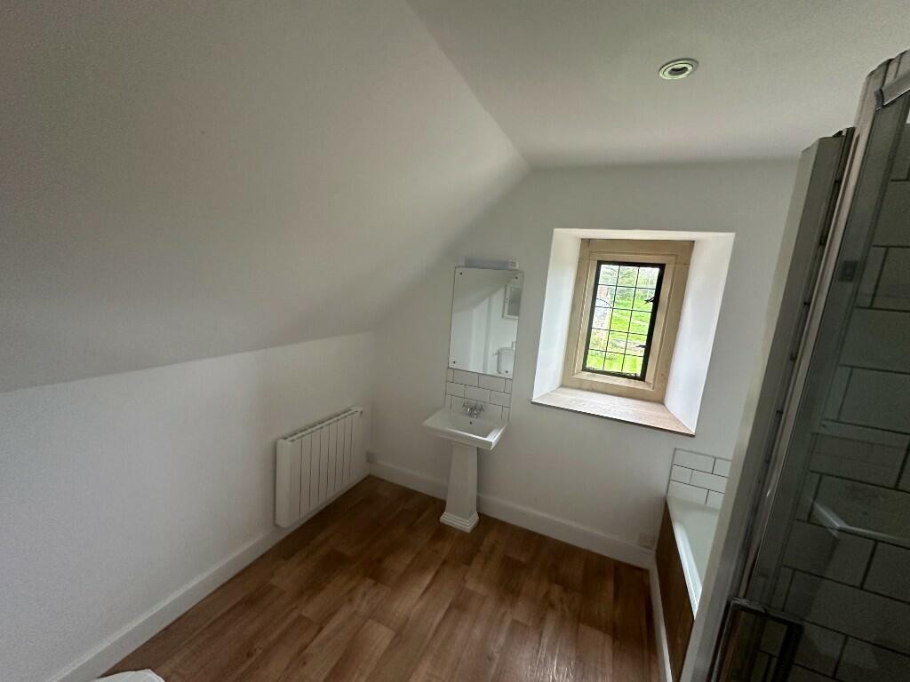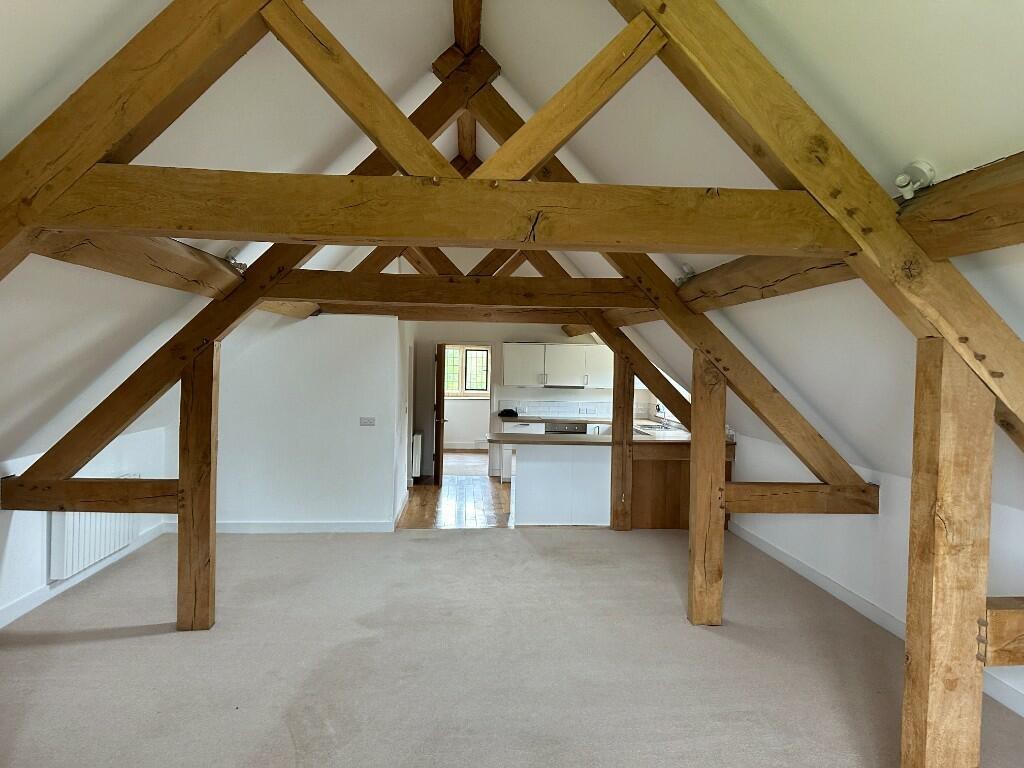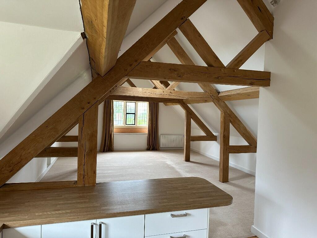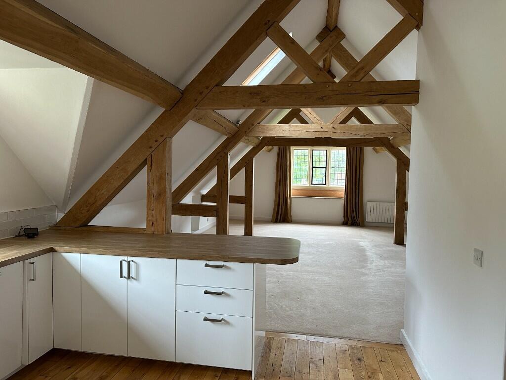 The apartment is accessed via stone steps which lead up to a reception hallway with space for appliances. The kitchen has a comprehensive range of fitted units including an integrated dishwasher. The large lounge / dining room is accessed off the kitchen. There is a hallway, with some cupboards for storage, leading to the two double bedrooms which have storage under the eaves. The bathroom comprises a bath, shower, basin and WC.